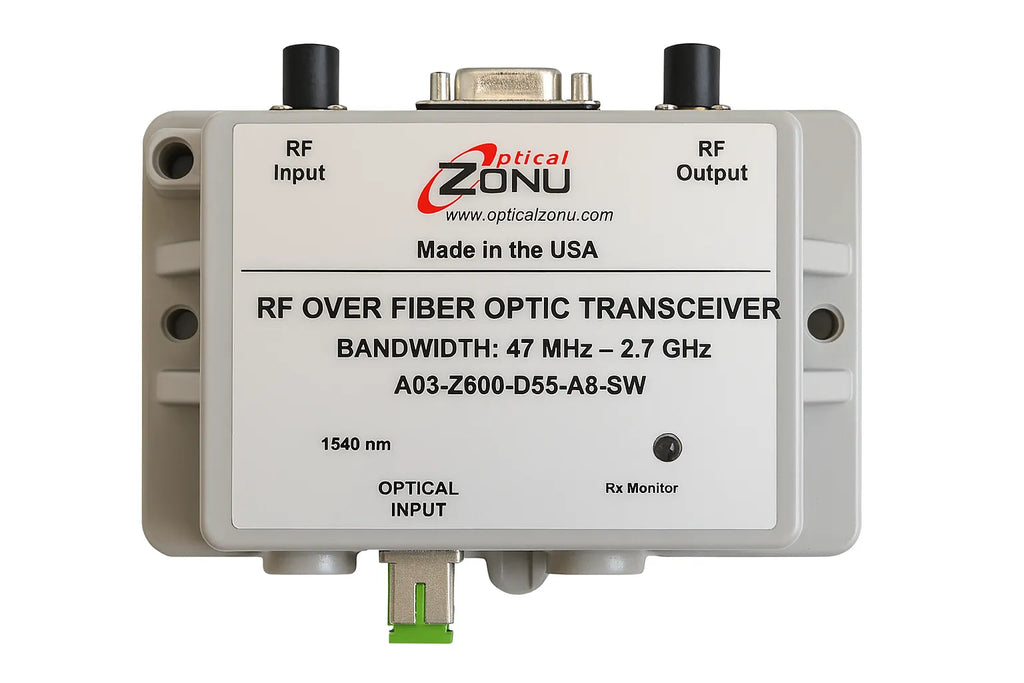 The Optical Zonu A03-Z600-D55-AS-SW is a high-performance RF over Fiber transceiver designed for transporting RF signals over single-mode fiber using a 1550 nm DFB laser. With a wide operating frequency range from 30 MHz to 3 GHz and integrated WDM functionality, it supports both unidirectional and bidirectional RF transport. This rugged, dust-tight module is ideal for applications like cellular backhaul, GPS distribution, antenna remoting, and in-building DAS deployments.